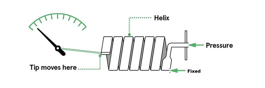 यह सेंसर mechanical amplification की आवश्यकता को समाप्त करने वाले spiral element की तुलना में free end को और भी अधिक गति पैदा करता है। helical coil की range व्यास, दीवार की मोटाई, उपयोग किए गए कॉइल्स की संख्या और निर्माण मैटारियल से प्रभावित होती है। उच्च दबाव तत्वों में 20 कॉइल हो सकते हैं जबकि कम span सेंसर में केवल 2 या 3 कॉइल हो सकते हैं। helical तत्व 0 से 30 psi से 0 से 80,000 psi तक की span के साथ उपलब्ध हैं।